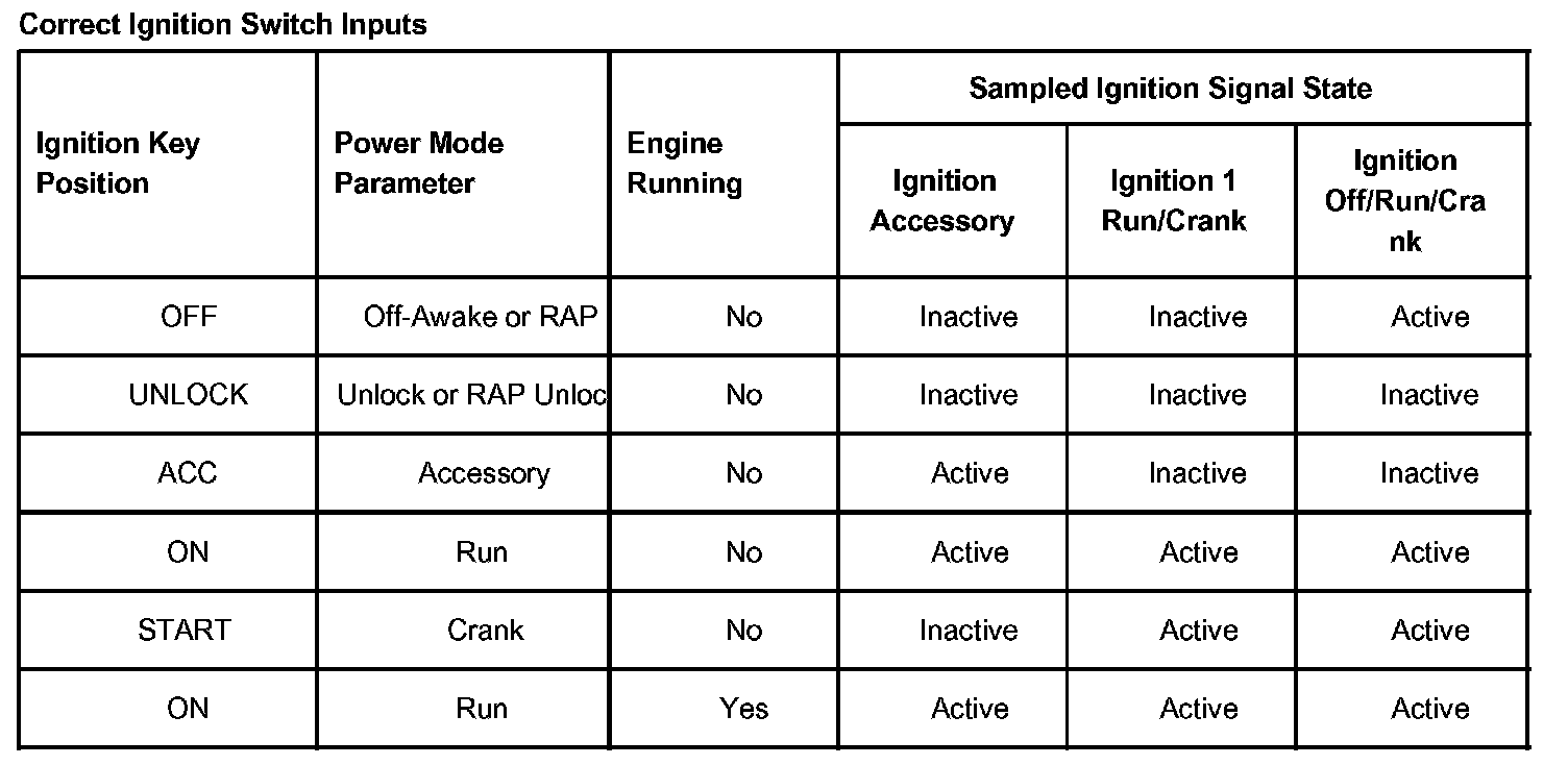 On vehicles that have several control modules connected by serial data circuits, one module is the power mode master (PMM). On this vehicle the PMM is the body control module (BCM). The BCM uses 3 signals from the ignition switch. These are the Ignition Off/Run/Crank, Ignition 1 Run/Crank, and Ignition Accessory.
