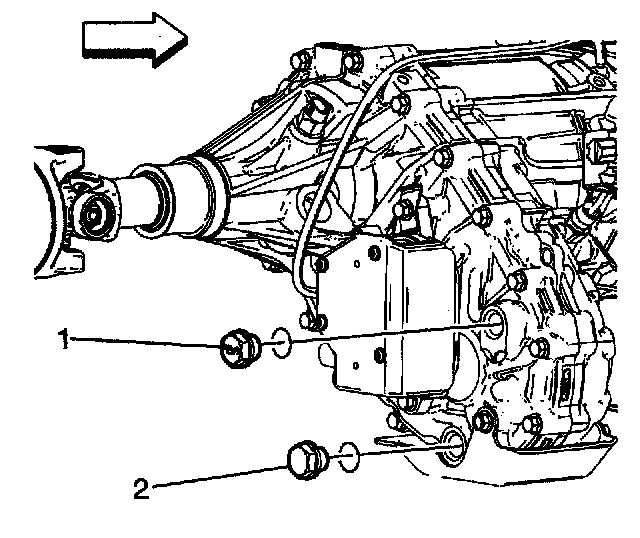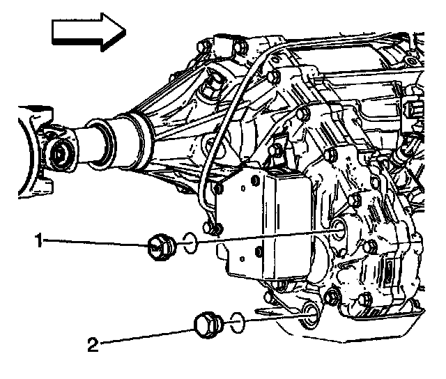 5. Remove the transfer case fluid drain plug (2) and O-ring gasket. Allow the transfer case fluid to drain into the container.