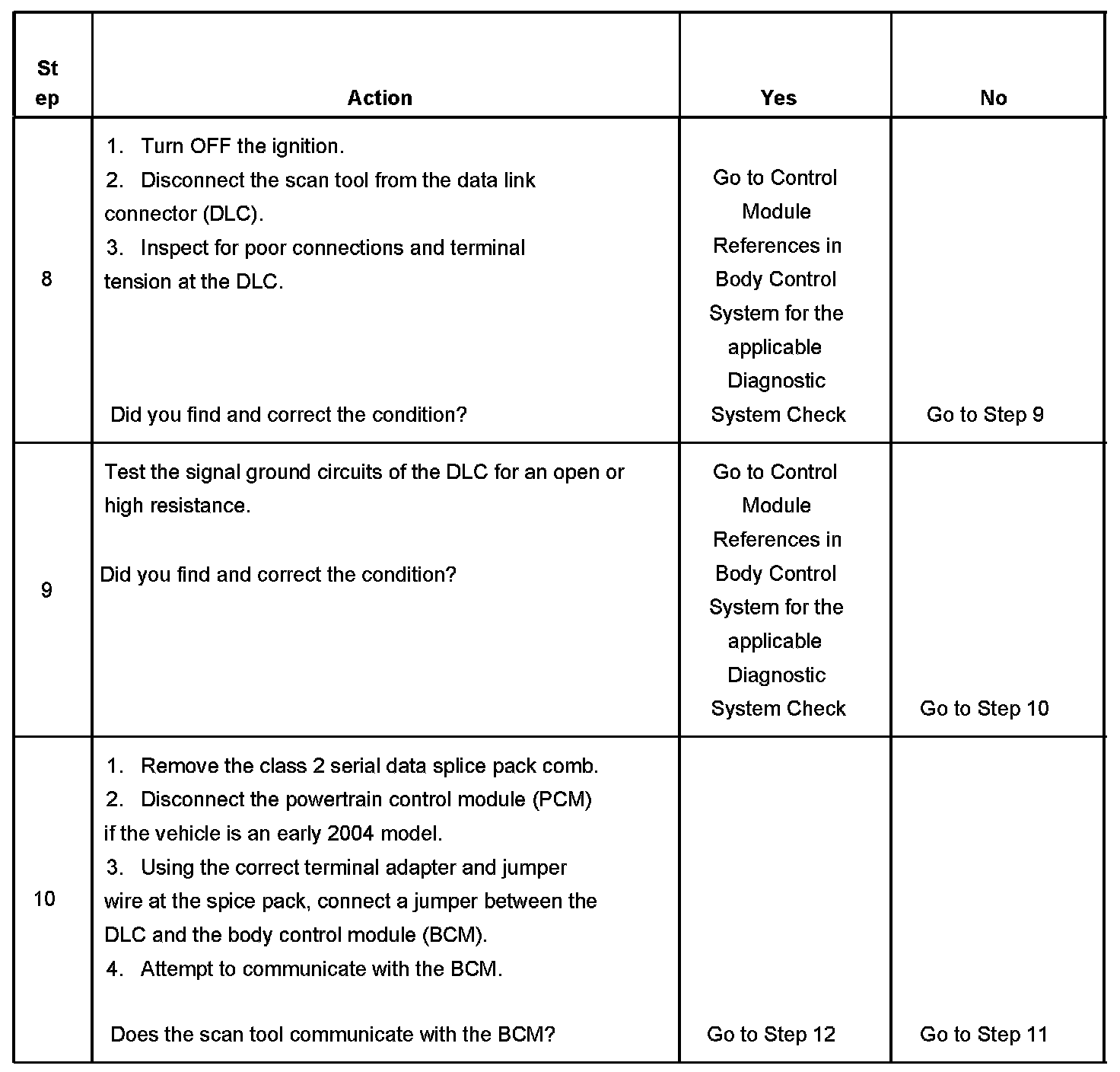 10. Normal class 2 serial data communication cannot take place until the body control module (BCM) sends the appropriate power mode message. If the BCM does not send a wake-up message, other modules on the class 2 serial data circuit may not communicate. Early 2004 model vehicles have a redundant class 2 serial data circuit between the BCM and PCM. Late 2004 model vehicles do not have this circuit and it is not necessary to disconnect the PCM to perform this step.