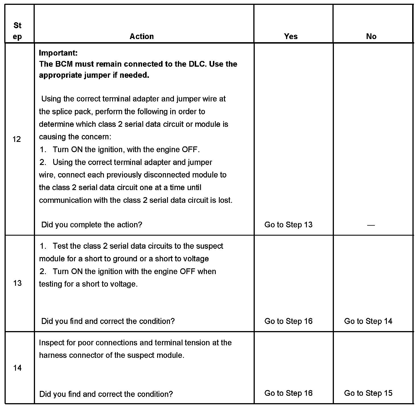 12. Normal class 2 serial data communication cannot take place until the body control module (BCM) sends the appropriate power mode message. If the BCM does not send a wake-up message, other modules on the class 2 serial data circuit may not communicate.