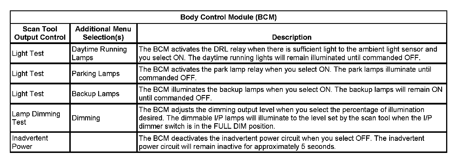 Scan Tool Output Controls - Body Control Module (BCM)