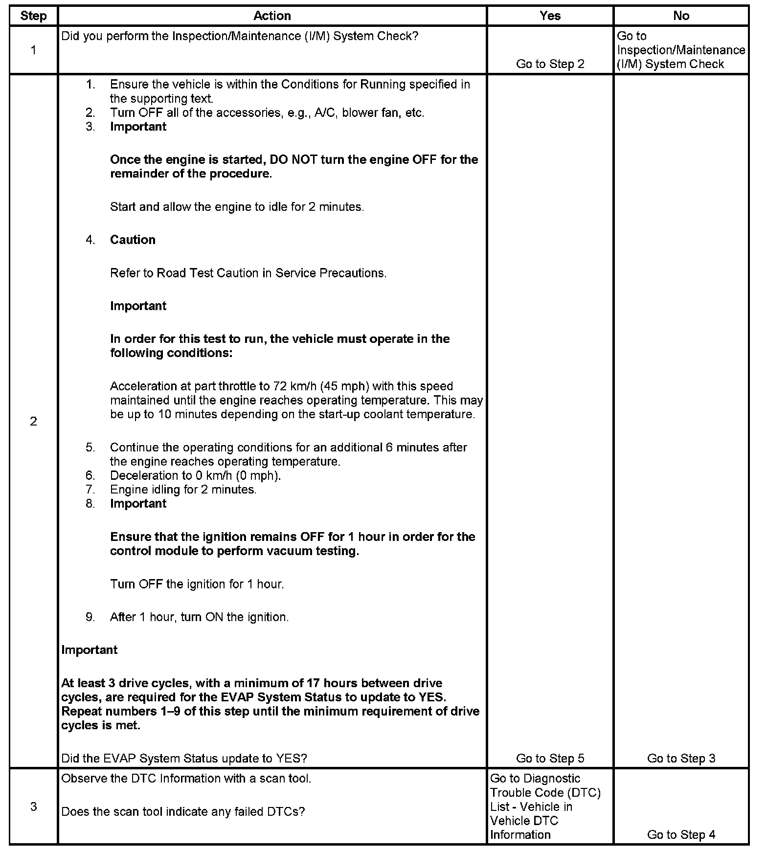 The purpose of this procedure is to satisfy the enable criteria necessary to execute an inspection/maintenance (I/M) system monitor for the evaporative emission (EVAP) system. The system monitor is comprised of the test results from one or more DTCs. This procedure may be used to set the EVAP I/M System Status display on the scan tool to YES. The EVAP I/M System Status display indicates whether or not the control module has completed the system monitor. The system monitor completes when either all DTCs comprising the monitor run and pass, or any DTC comprising the monitor illuminates the malfunction indicator lamp (MIL). If one of the DTCs comprising the monitor is set and the MIL is not illuminated, the necessary trips are required to illuminate the MIL before the monitor will complete.