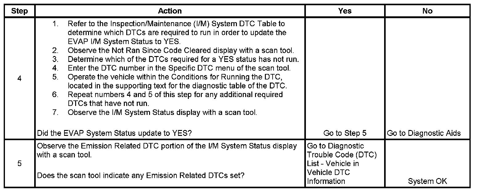 If there is an impending failure, the system may require more time to run than was allotted in the procedure. If any DTCs do not run after numerous attempts and no DTC is set, review the scan tool data list and conditions for running. This will give an indication of why the DTCs do not complete. If the EVAP I/M System Status does not update to YES, the procedure can be repeated until a YES status is achieved.