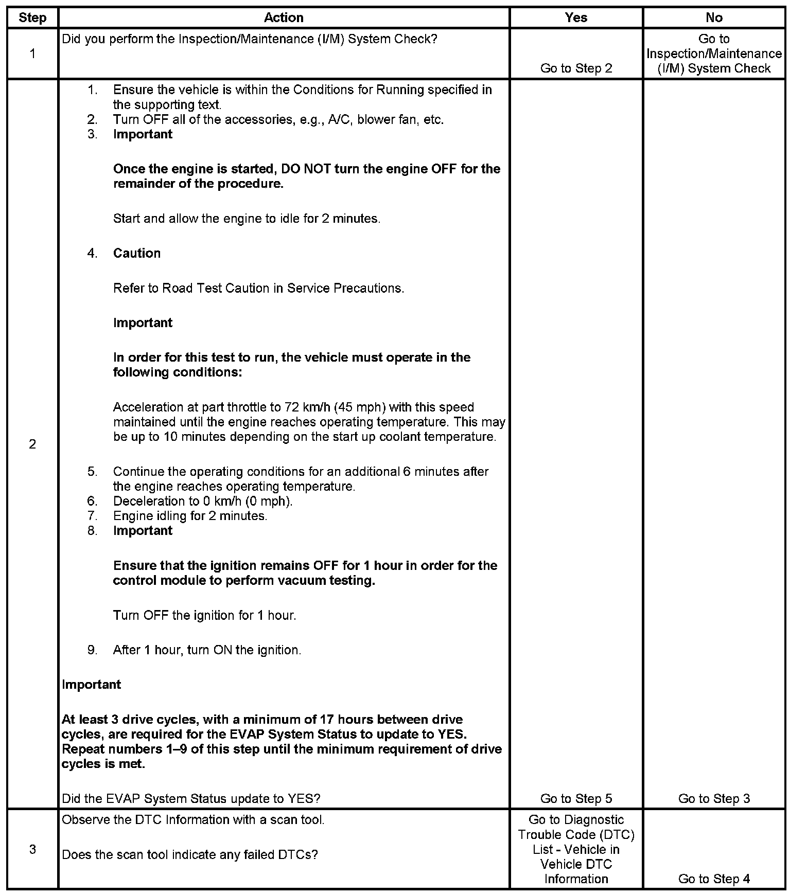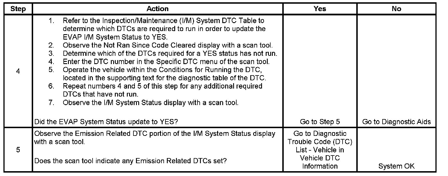 If there is an impending failure, the system may require more time to run than was allotted in the procedure. If any DTCs do not run after numerous attempts and no DTC is set, review the scan tool data list and conditions for running. This will give an indication of why the DTCs do not complete. If the EVAP I/M System Status does not update to YES, the procedure can be repeated until a YES status is achieved.