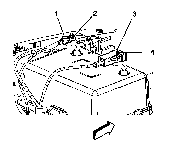 7. Remove the nut (3) securing the battery positive cable (4) to the underhood fuse block (1).