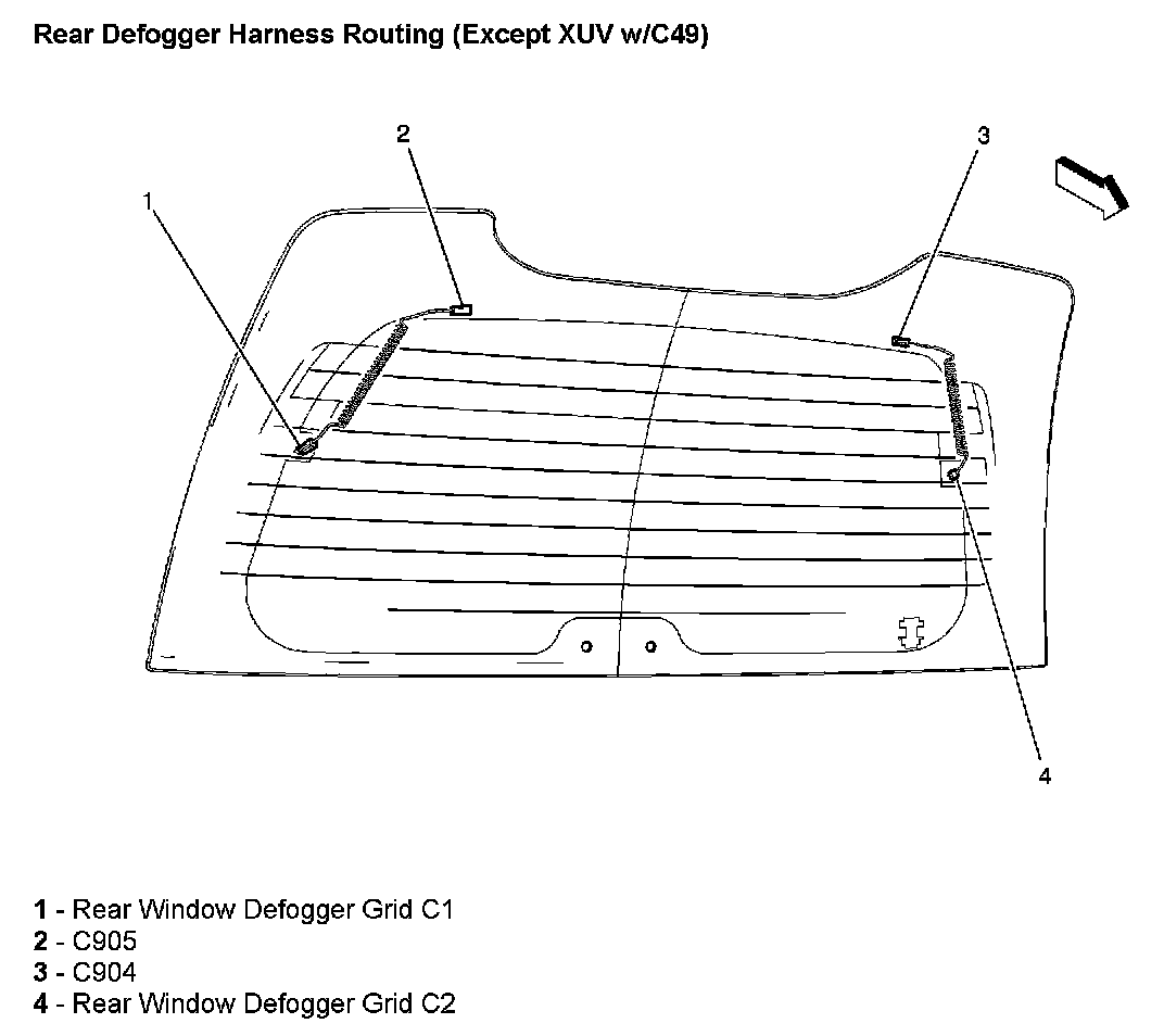 Rear Defogger Harness Routing (Except XUV With RPO Code C49):