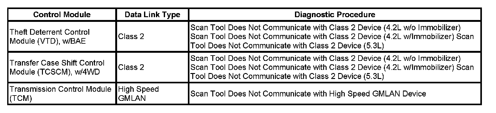 This table identifies which serial data link that a particular module uses for in-vehicle data transmission. Some modules may use more than one data link to communicate. Some modules may have multiple communication circuits passing through them without actively communicating on that data link. This table is used to assist in correcting a communication malfunction. For the description and operation of these serial data communication circuits refer to Data Link Communications Description and Operation.