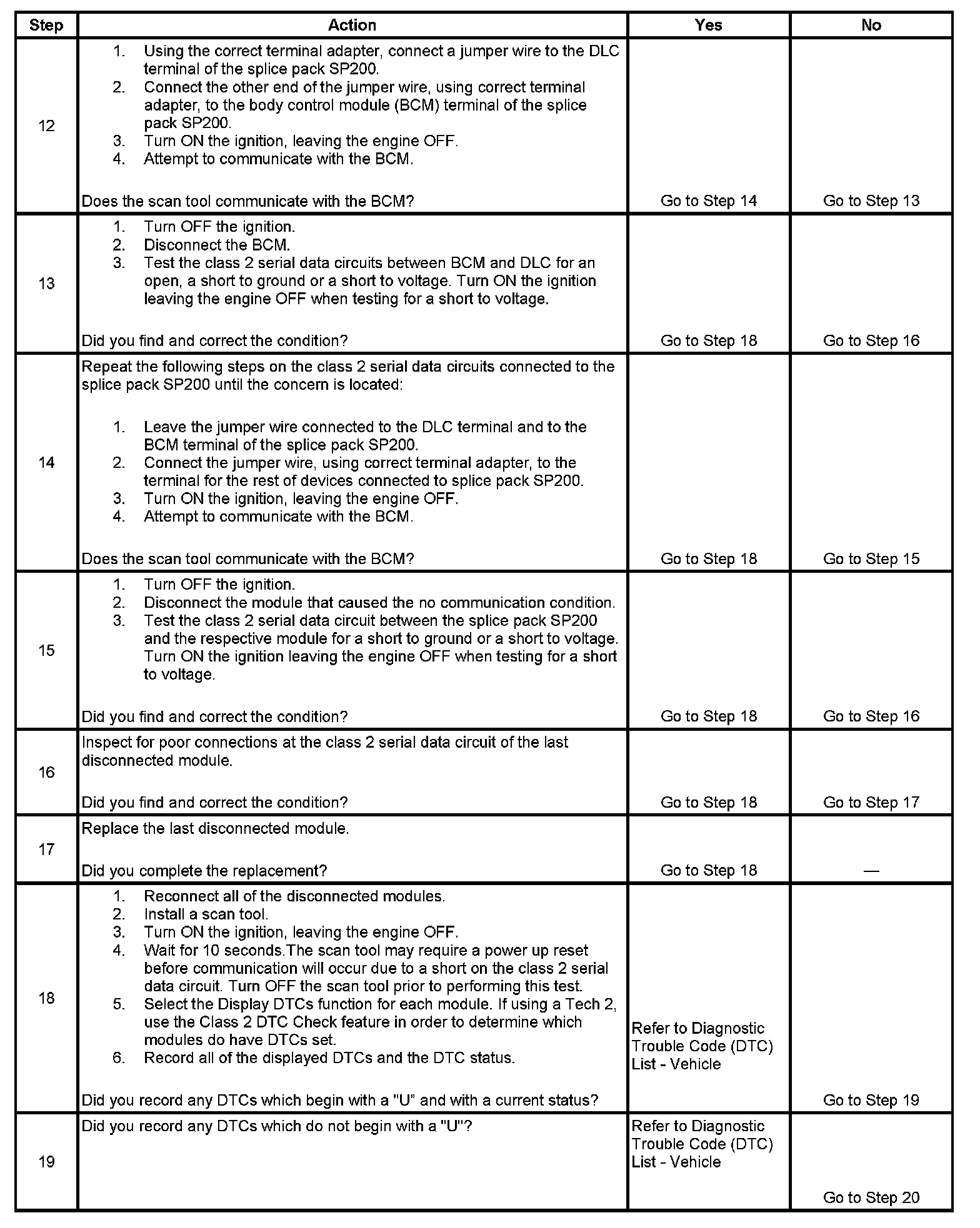 12. The class 2 serial data circuit is shorted to voltage or ground. The condition may be due to the wiring or due to a malfunction in one of the modules. When testing the wire for a short, make sure there is not a module connected to the wire being tested. This test isolates the BCM class 2 serial data circuits.