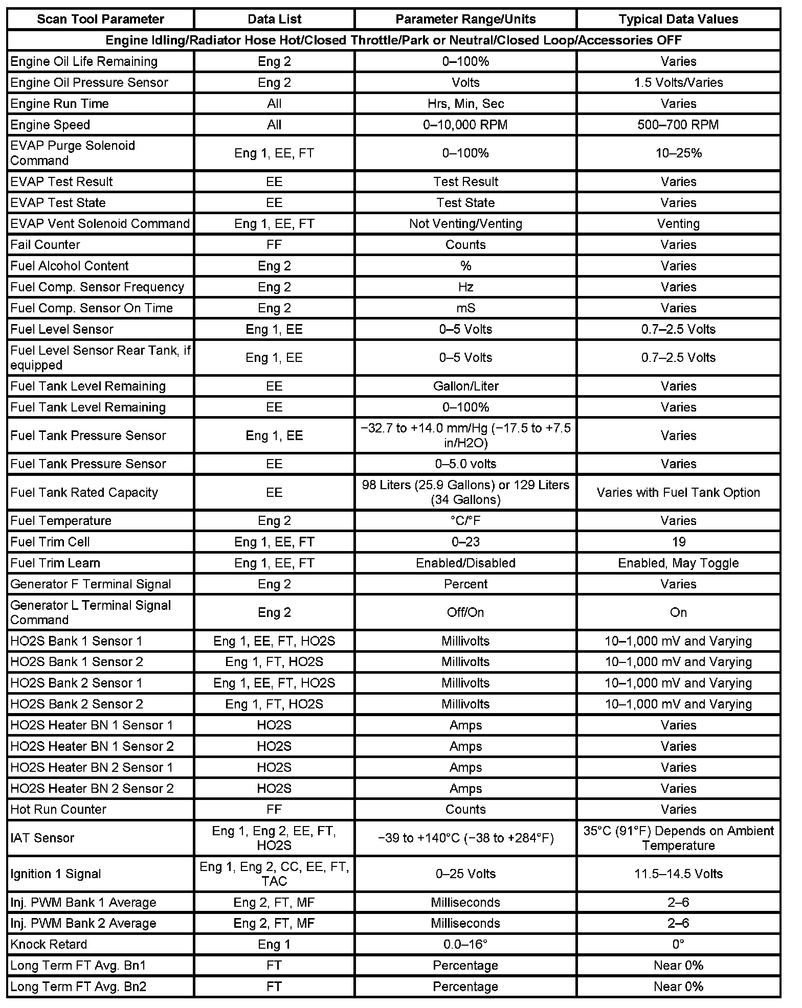 Scan tool values from a properly running engine may be used for comparison with the engine you are diagnosing. The Engine Scan Tool Data List represents values that would be seen on a normal running engine.