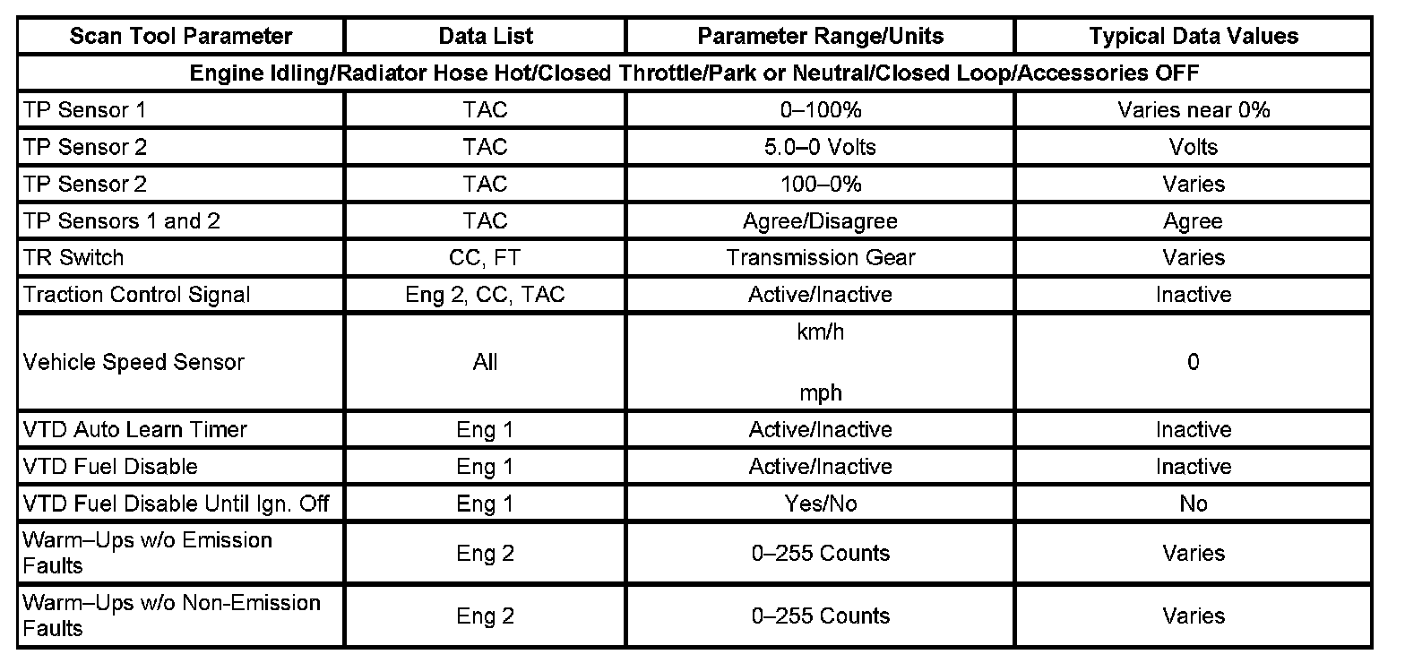 Only the parameters listed below are referenced in this service data for use in diagnosis. If all values are within the typical range described below, refer to Symptoms - Computers and Control Systems for diagnosis. Symptom Related Diagnostic Procedures
