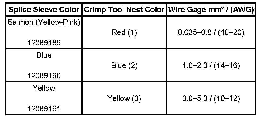 6. Select the proper duraseal splice sleeve according to the wire size. Refer to the above table at the beginning of the repair procedure for the color coding of the duraseal splice sleeves and the crimp tool nests.