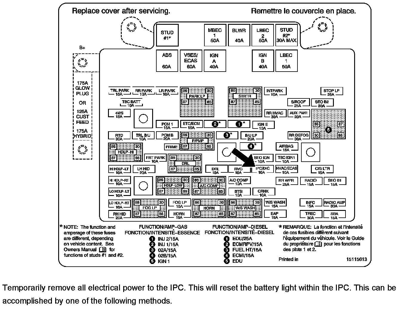 ^ Remove the IPC/DIC fuse from the Underhood Fuse Block for approximately 30 seconds. Refer to the diagram for the location of the fuse.