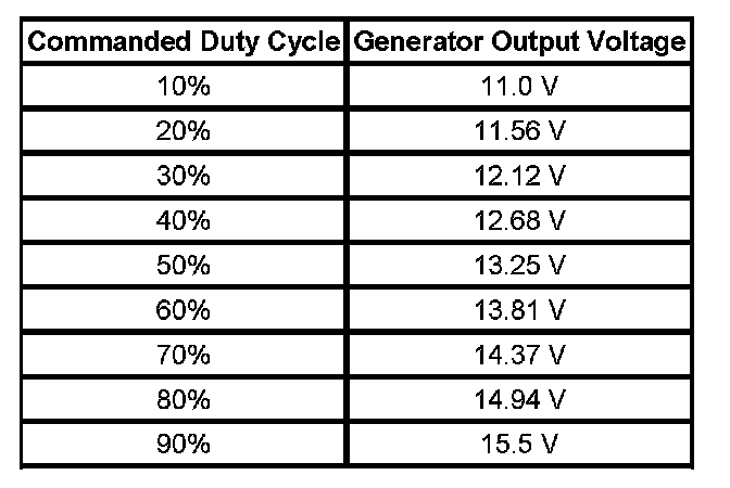 The generator battery control module monitors the generator performance though the generator field duty cycle signal circuit, the generator field control circuit, and the battery positive voltage circuit. The generator battery control module controls the generator through the generator field control, charge indicator control, circuit. The signal is a 5-volt pulse width modulation (PWM) signal of 128 Hz +/- 5% with a duty cycle of 0-100 percent. The duty cycle sent by the generator battery control module is limited between 36-90%. When the engine is turned OFF, the module will send 0% duty cycle, low voltage. When there is loss of class 2 communication with the powertrain control module (PCM), the module will send 100% duty cycle, 13.8 volts. The table shows the commanded duty cycle and output voltage of the generator.