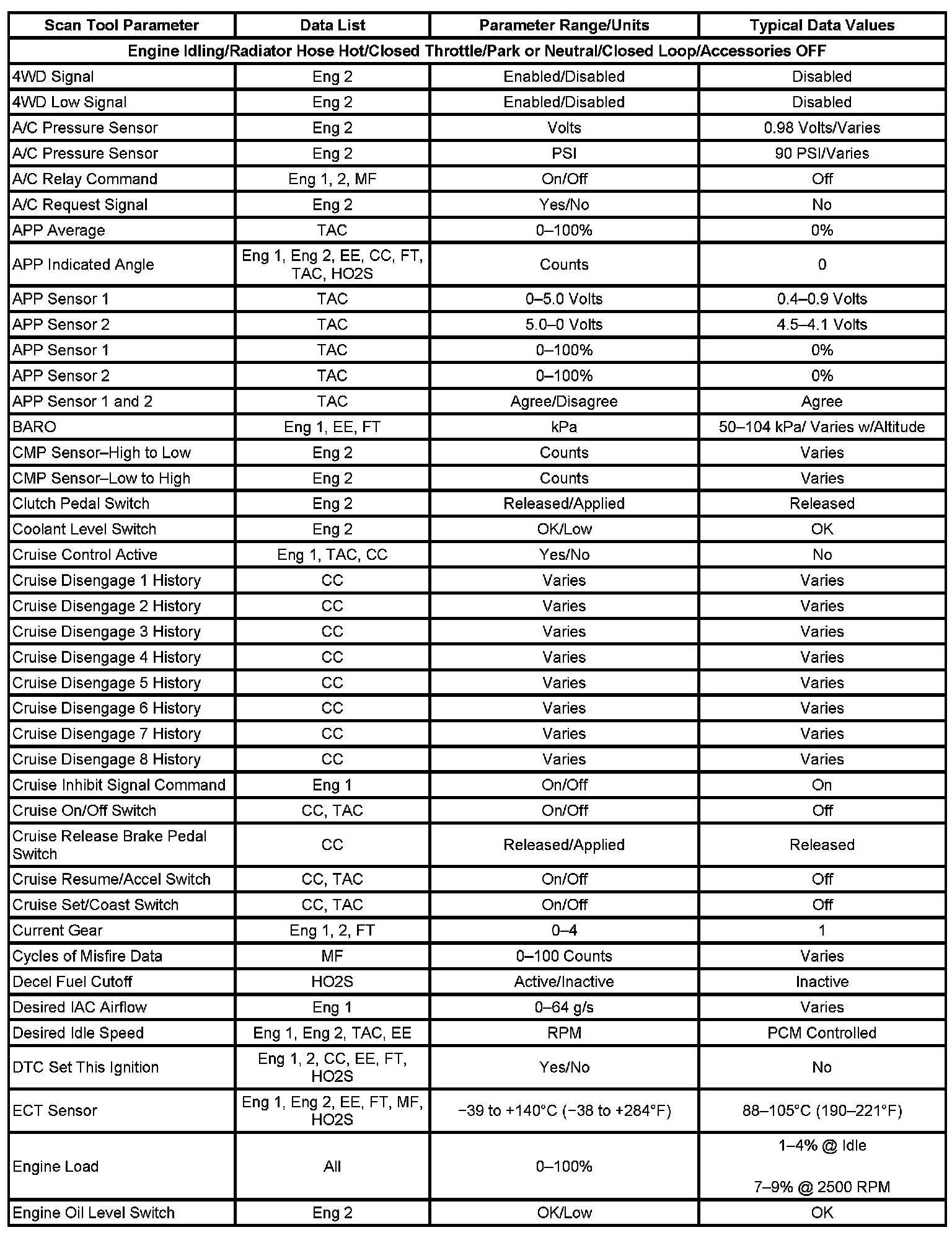 The Engine Scan Tool Data List contains all engine related parameters that are available on the scan tool. The list is arranged in alphabetical order. A given parameter may appear in any one of the data lists, and in some cases may appear more than once, or in more than one data list in order to group certain related parameters together.