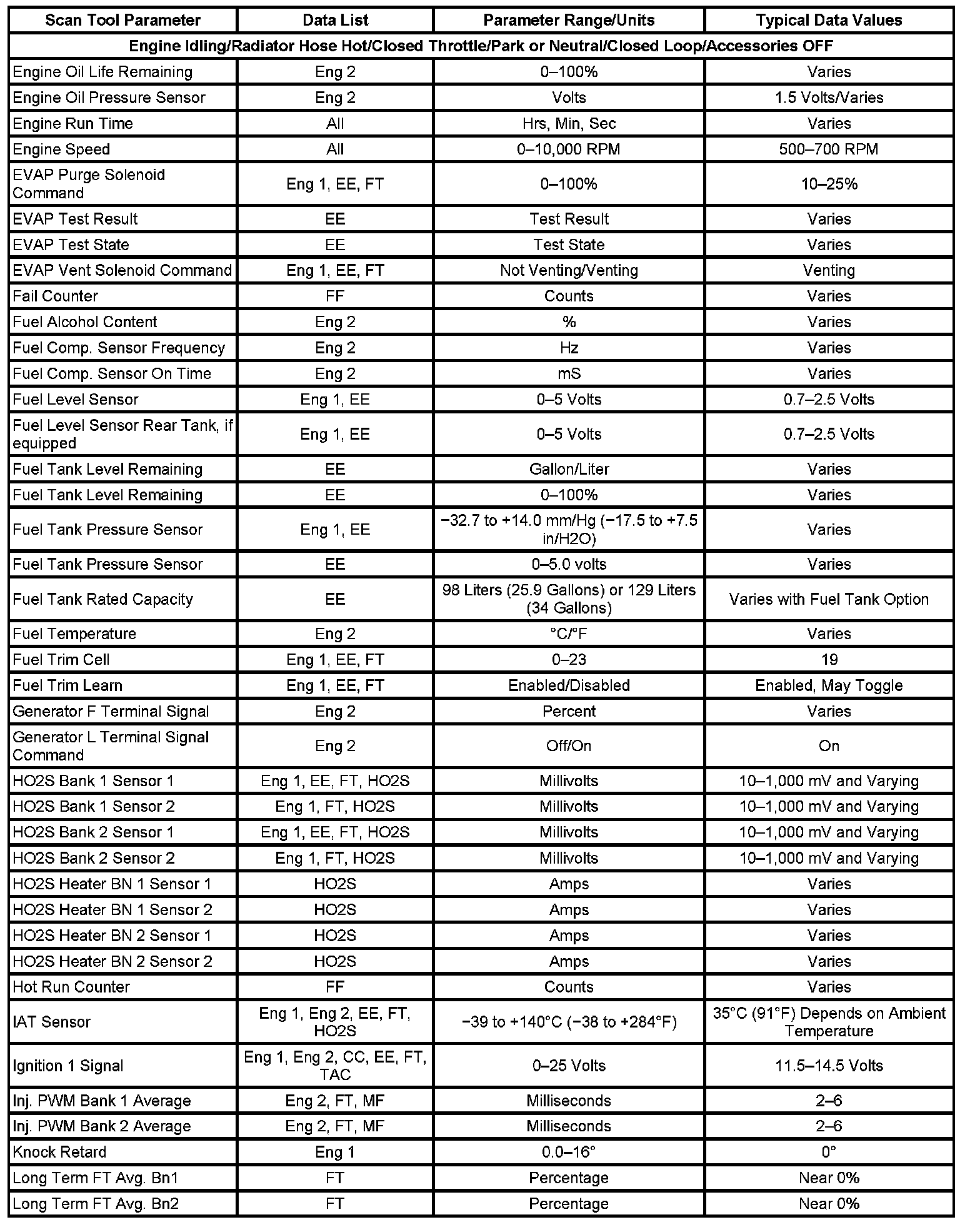 Scan tool values from a properly running engine may be used for comparison with the engine you are diagnosing. The Engine Scan Tool Data List represents values that would be seen on a normal running engine.