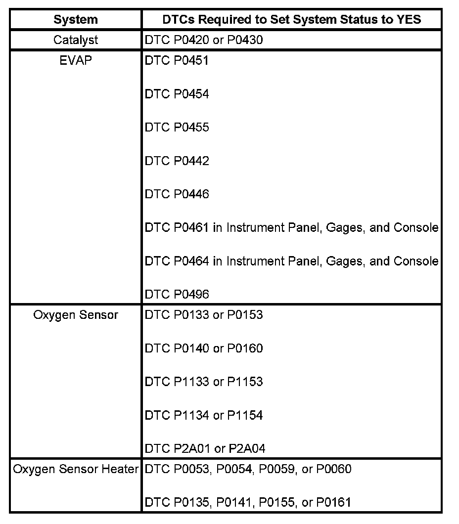Inspection/Maintenance (I/M) System DTC Table: