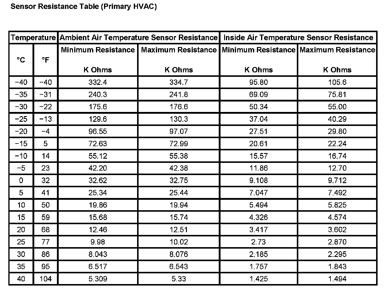Sensor Resistance Table (Primary HVAC):