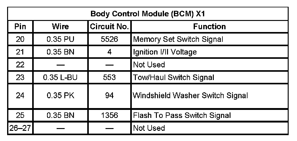 Body Control Module (BCM) X1 Pin 20 To 27: