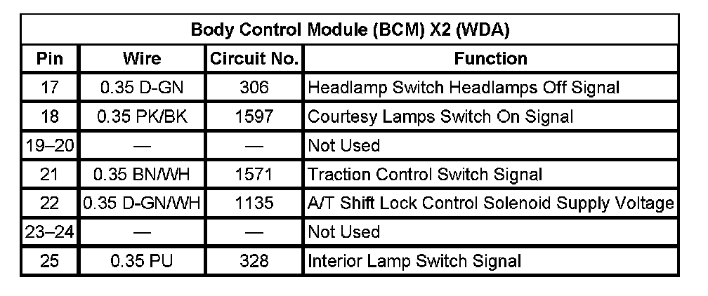 Body Control Module (BCM) X2 (With RPO Code WDA) Pin 17 To 25: