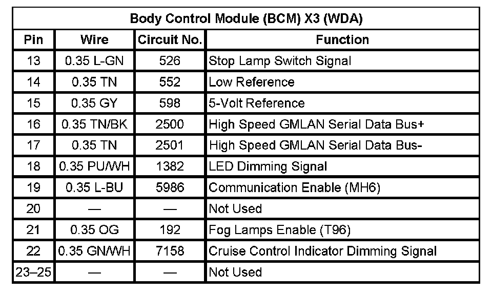Body Control Module (BCM) X3 (With RPO Code WDA) Pin 13 To 25: