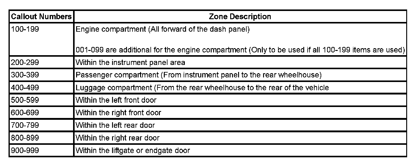 All grounds, in-line connectors, pass-through grommets, and splices have identifying numbers that correspond to where they are located in the vehicle. The following table explains the numbering system.
