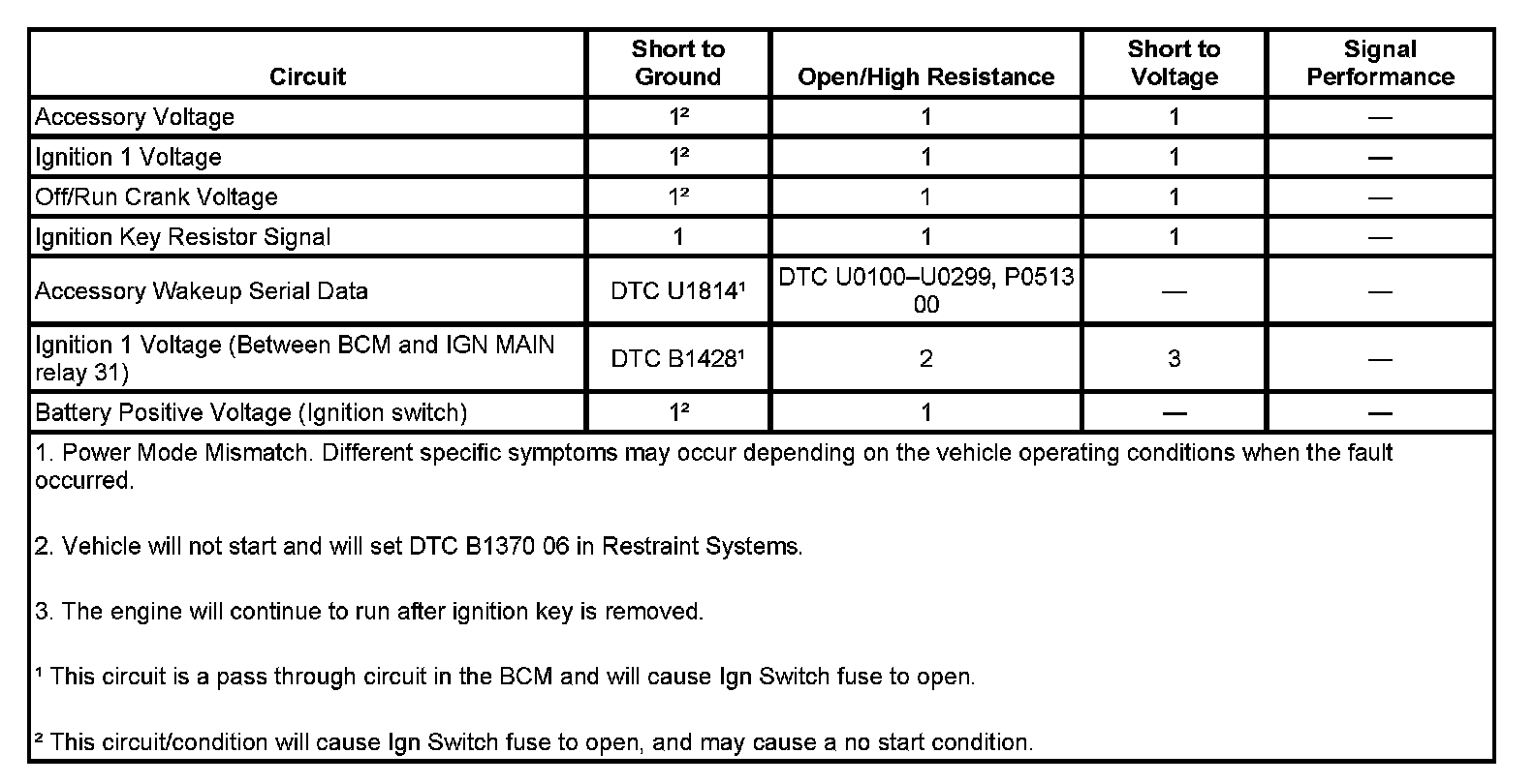 Some system functions may operate one time and not the next with a specific fault in the ignition switch circuits depending on the vehicle operating conditions when the fault occurred. Some examples are as follows: