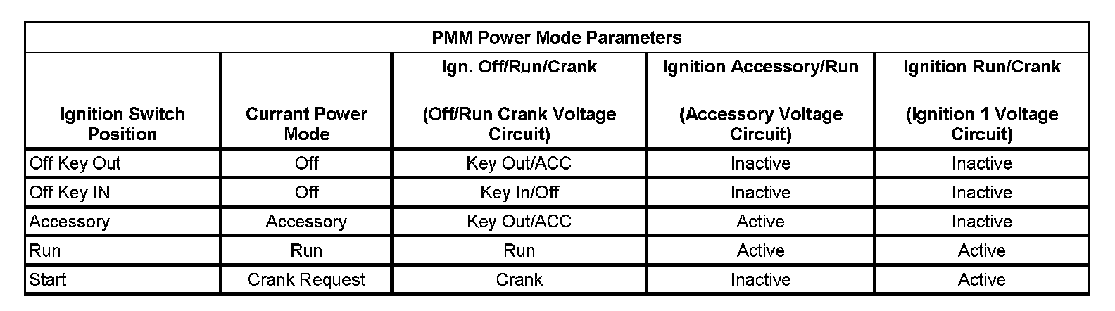 2. With a scan tool, access Body Control Module, Power Mode data display list and compare all parameters listed with the corresponding ignition key position. The PMM Power Mode Parameters table below illustrates the correct state of these input parameters (circuits) in correspondence to the ignition switch position. The circuits which the individual parameters are related to are in parentheses.