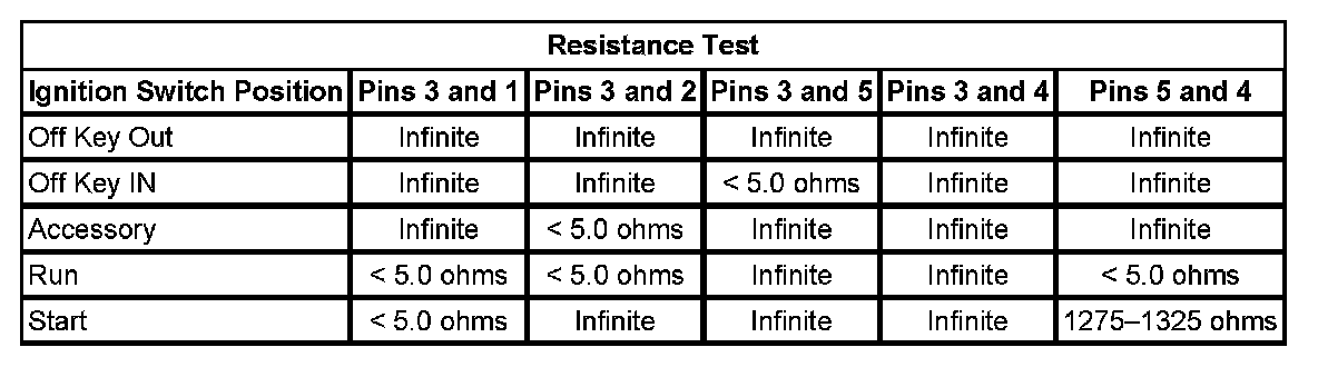 Using the Resistance Test below, check the resistance between the pins of the ignition switch listed in each switch position listed.
