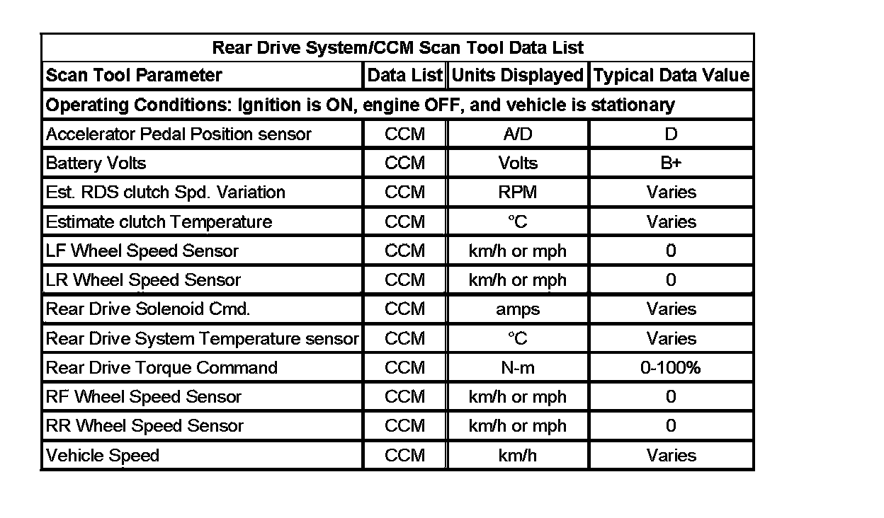 The rear differential clutch control module (CCM) Scan Tool Data Lists contain all the clutch control module system related parameters that are available on the scan tool. The parameters in the list are arranged in alphabetical order. The column, "Data List," indicates the location of the parameter within the scan tool menu selections.