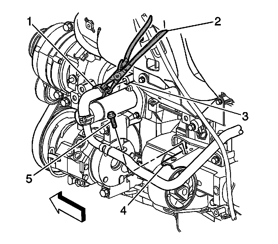 48. Position the J 38185 (2) to the clamp (1) in order to remove the heater outlet hose from the heater outlet hose fitting (3).