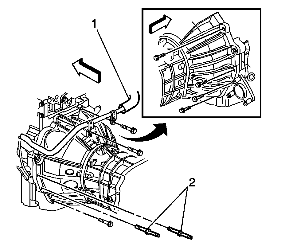 56. Remove the nuts (2) securing the fuel hose/pipe bracket (1) to the transmission (M30 only).