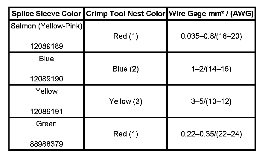 4. Select the proper DuraSeal splice sleeve according to the wire size. Refer to the above table at the beginning of the repair procedure for the color coding of the DuraSeal splice sleeves and the crimp tool nests.