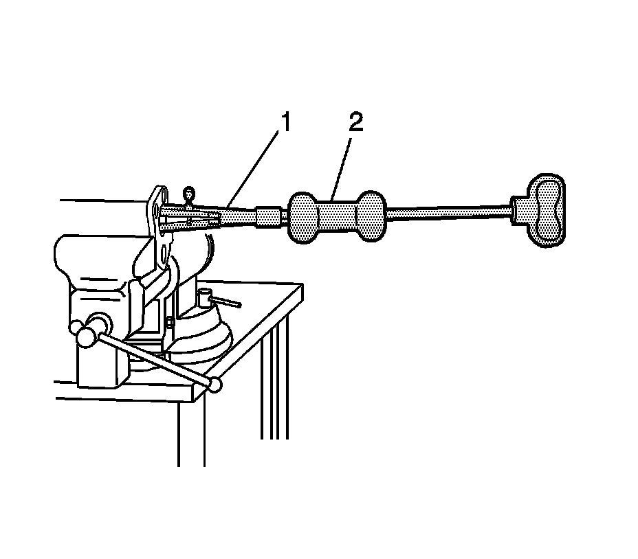 11. Using the J 29369-1 (1) and the J 2619-01 (2), remove the inner drive shaft bearing.