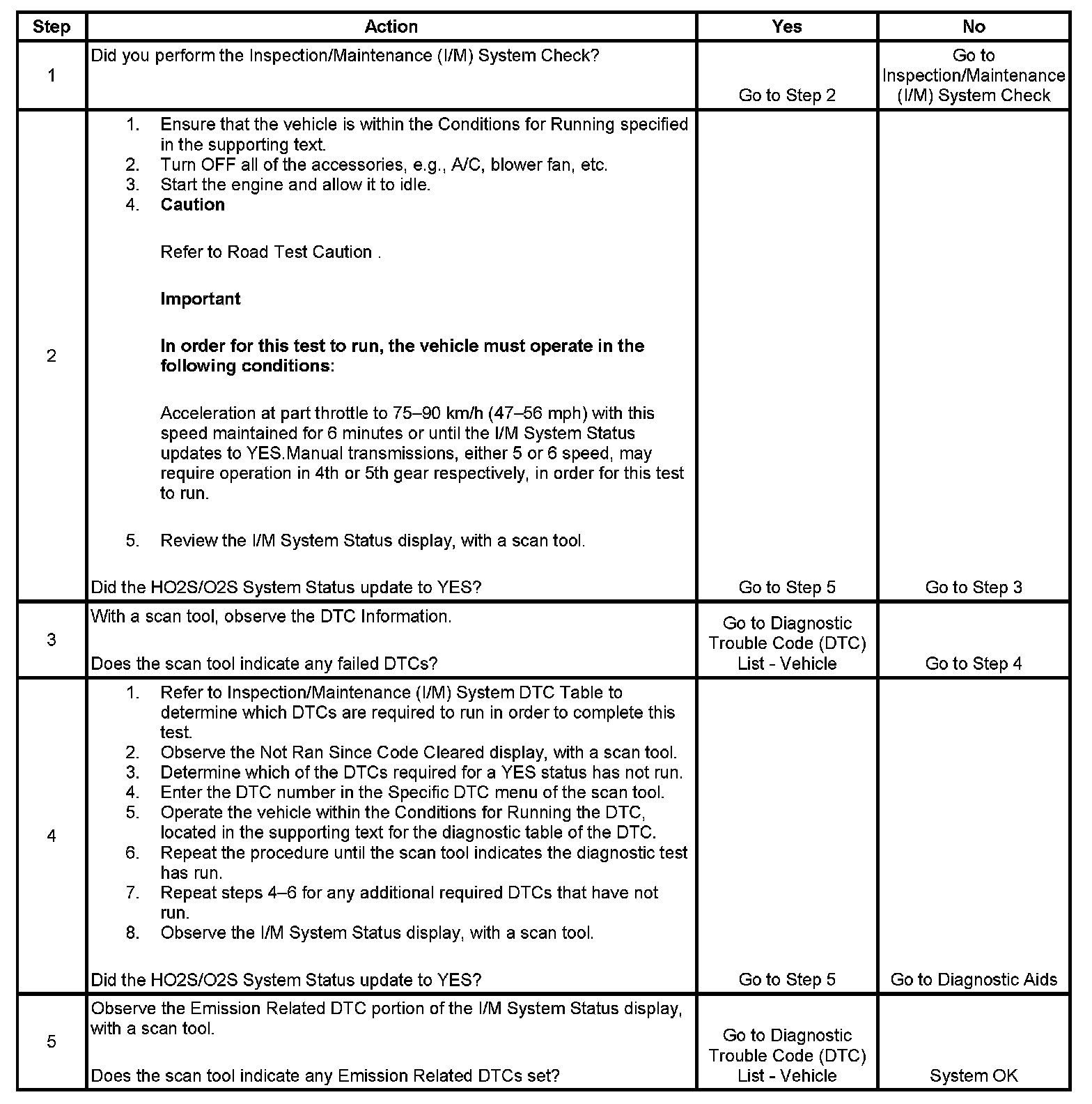 The purpose of this test is to satisfy the enable criteria necessary to execute inspection/maintenance (I/M) readiness diagnostics for the oxygen sensor (O2S, HO2S) system. The test may be used to set the I/M System Status to YES.