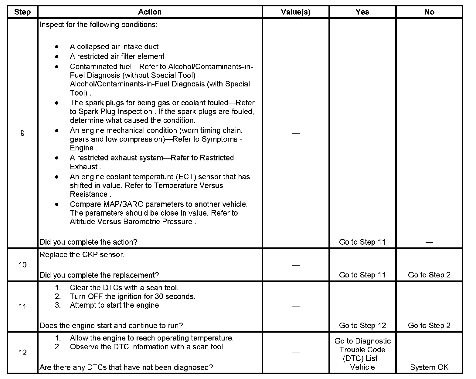The Engine Cranks but Does Not Run diagnostic table is an organized approach to identifying a condition that causes an engine not to start. The Engine Cranks but Does Not Run diagnostic table directs the service technician to the appropriate system diagnosis.