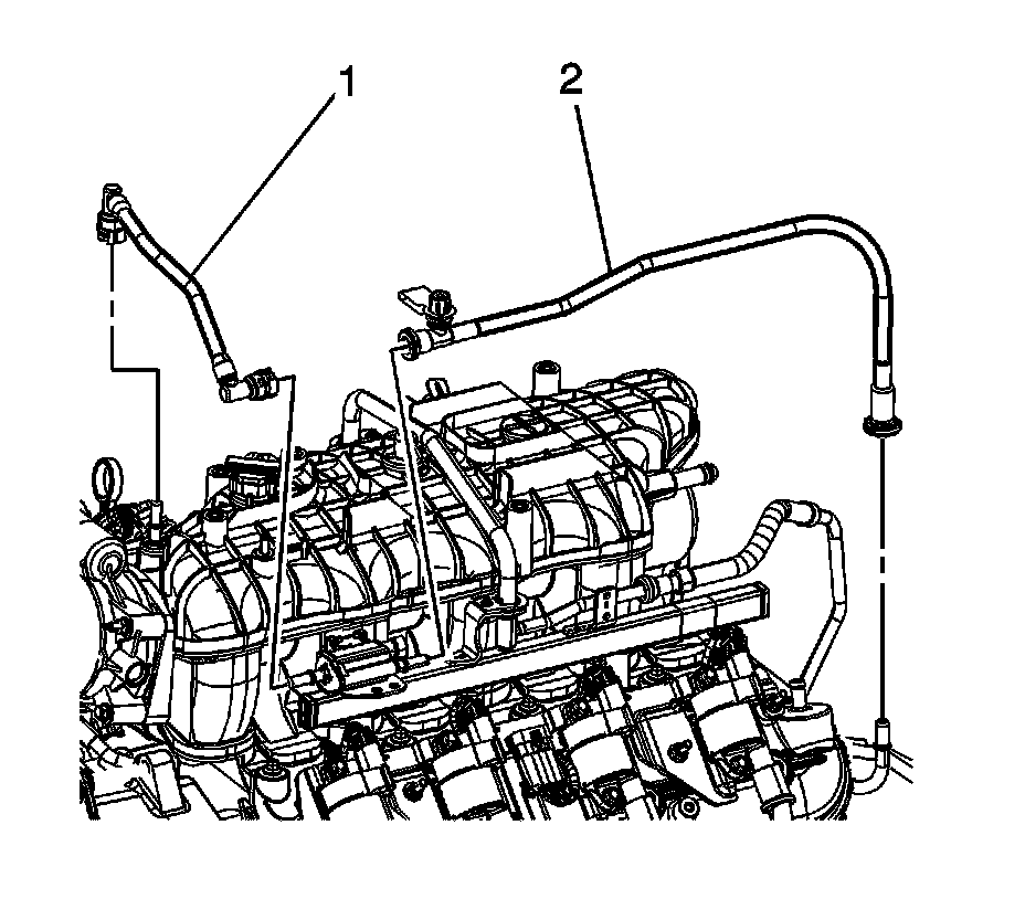 13. Remove the EVAP purge solenoid vent tubes (1, 2). Refer to Plastic Collar Quick Connect Fitting Service.