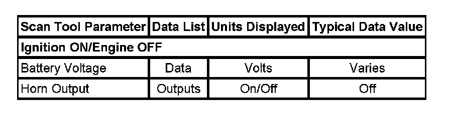 The Horns Scan Tool Data List contains all of the horn related parameters that are available on the scan tool. The parameters in the list are arranged in alphabetical order. The column, "Data List," indicates the location of the parameter within the scan tool menu selections. Use the Horns Scan Tool Data List as directed by a diagnostic table or in order to supplement the diagnostic procedures. Begin all of the diagnostic procedures with Diagnostic System Check - Vehicle. Initial Inspection and Diagnostic Overview