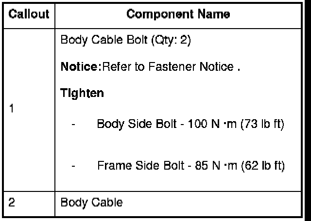 -Body Side Bolt - 100 N �m (73 lb ft)-Frame Side Bolt - 85 N �m (62 lb ft)