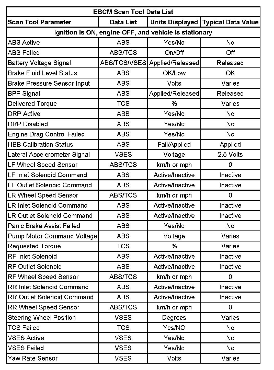 EBCM Scan Tool Data List: