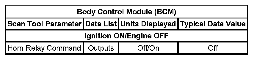 The Horns Scan Tool Data List contains all of the horn related parameters that are available on the scan tool. The parameters in the list are arranged in alphabetical order. The column, Data List, indicates the location of the parameter within the scan tool menu selections. Use the Horns Scan Tool Data List as directed by a diagnostic table or in order to supplement the diagnostic procedures.