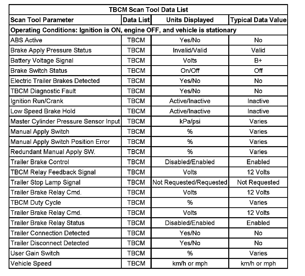TBCM Scan Tool Data List: