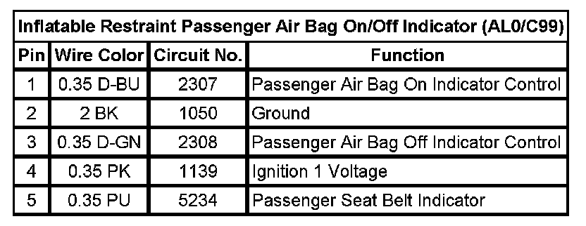 Inflatable Restraint Passenger Air Bag On/Off Indicator (AL0/C99)