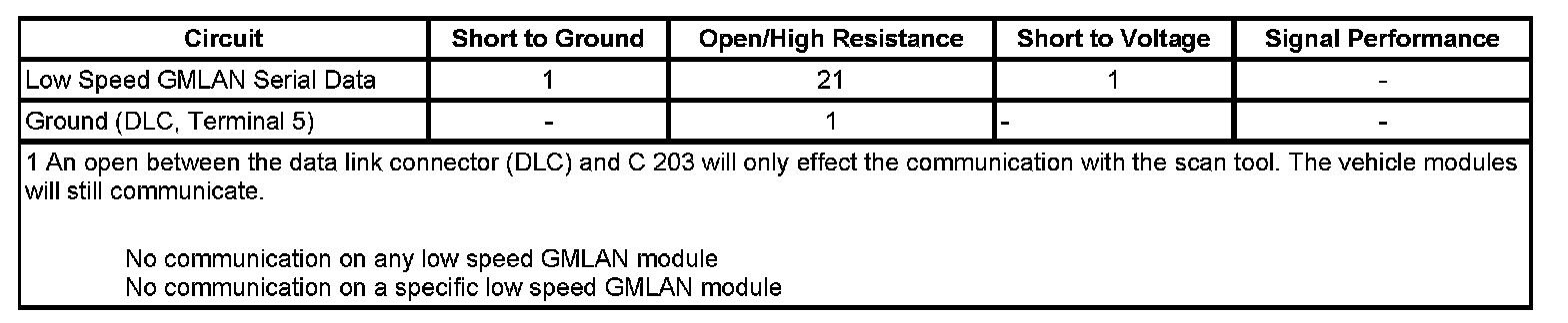 * This test is used for a total low speed GMLAN communication failure. If only 1 module is not communicating and sets no DTC, ensure that the vehicle is equipped with the module, then use DTC U0100-U0299 for diagnostics.