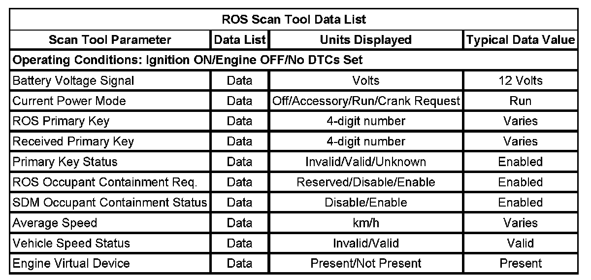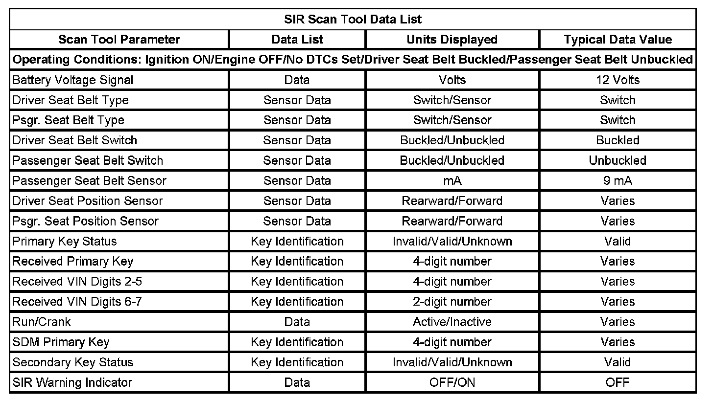 Use the SIR scan tool data list as directed by a diagnostic table or in order to supplement the diagnostic procedures. Begin all of the diagnostic procedures with the Diagnostic System Check - Restraint Systems. Use the SIR Scan Tool Data List after the following is determined: Initial Inspection and Diagnostic Overview