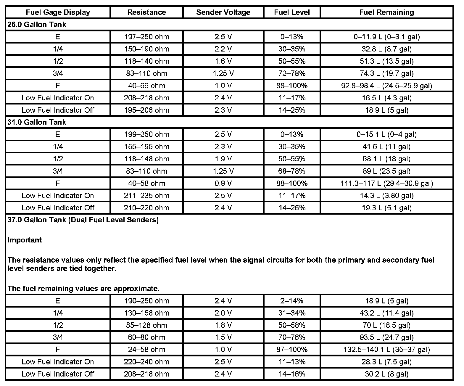 The information in this table is intended for use with the J 33431-C Signal Generator and Instrument Panel Tester. The fuel level sensor values represent the test values to be used on the Signal Generator to drive the fuel gage display to the indicated positions. Vehicles that require more than one fuel level sensor calculate gage position from many possible resistance combinations of fuel levels between the two tanks. Therefore, the values in the table may not correlate directly to readings taken from the vehicle primary or secondary sending units.