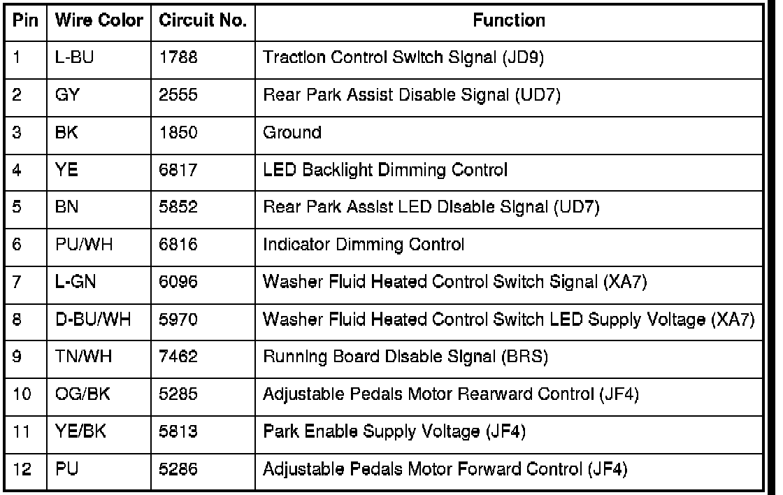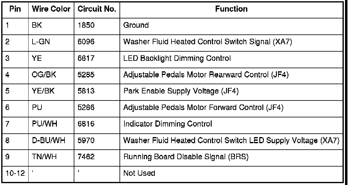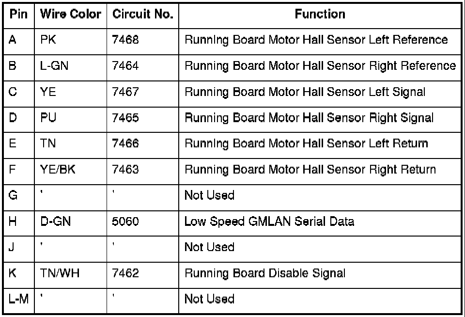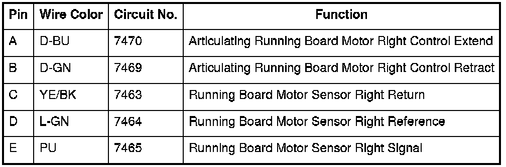 Table2: Assist Step Control Module C1 Assist Step Control Module C1 Table4: Assist Step Control Module C2 Table6: I/P Multifunction Switch Assembly (X88/Z88) Table8: I/P Multifunction Switch Assembly (Z75) Table10: Running Board - Left Table12: Running Board - Right