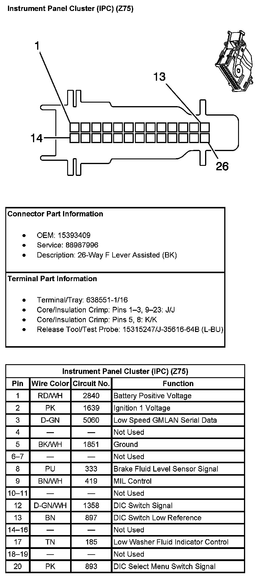 Instrument Panel Cluster (IPC) (With RPO Code Z75) (Pin 1 To 20):