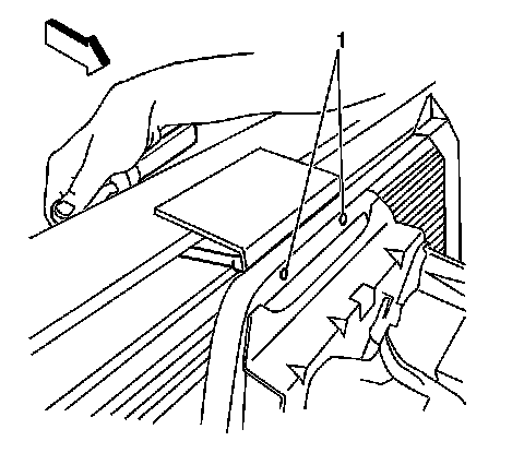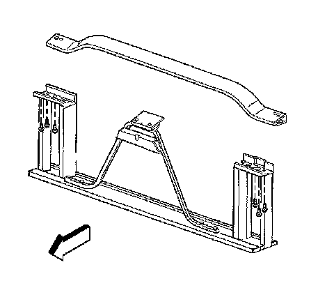 8. Install the tie bar to radiator brace bolts (1). Access the bolts from the rear of the upper radiator support.