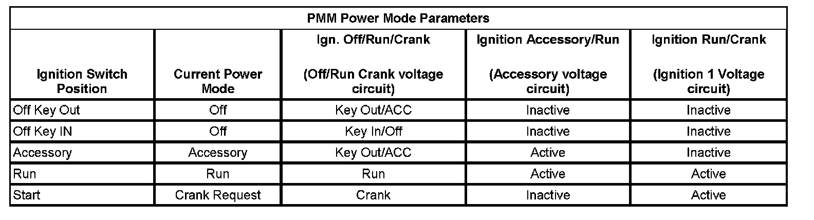- The power modes and controls are determined using BCM logic. Comparing the Body Control Module Power Mode data display parameters listed in Circuit/System Verification will determine if there is a power mode fault.