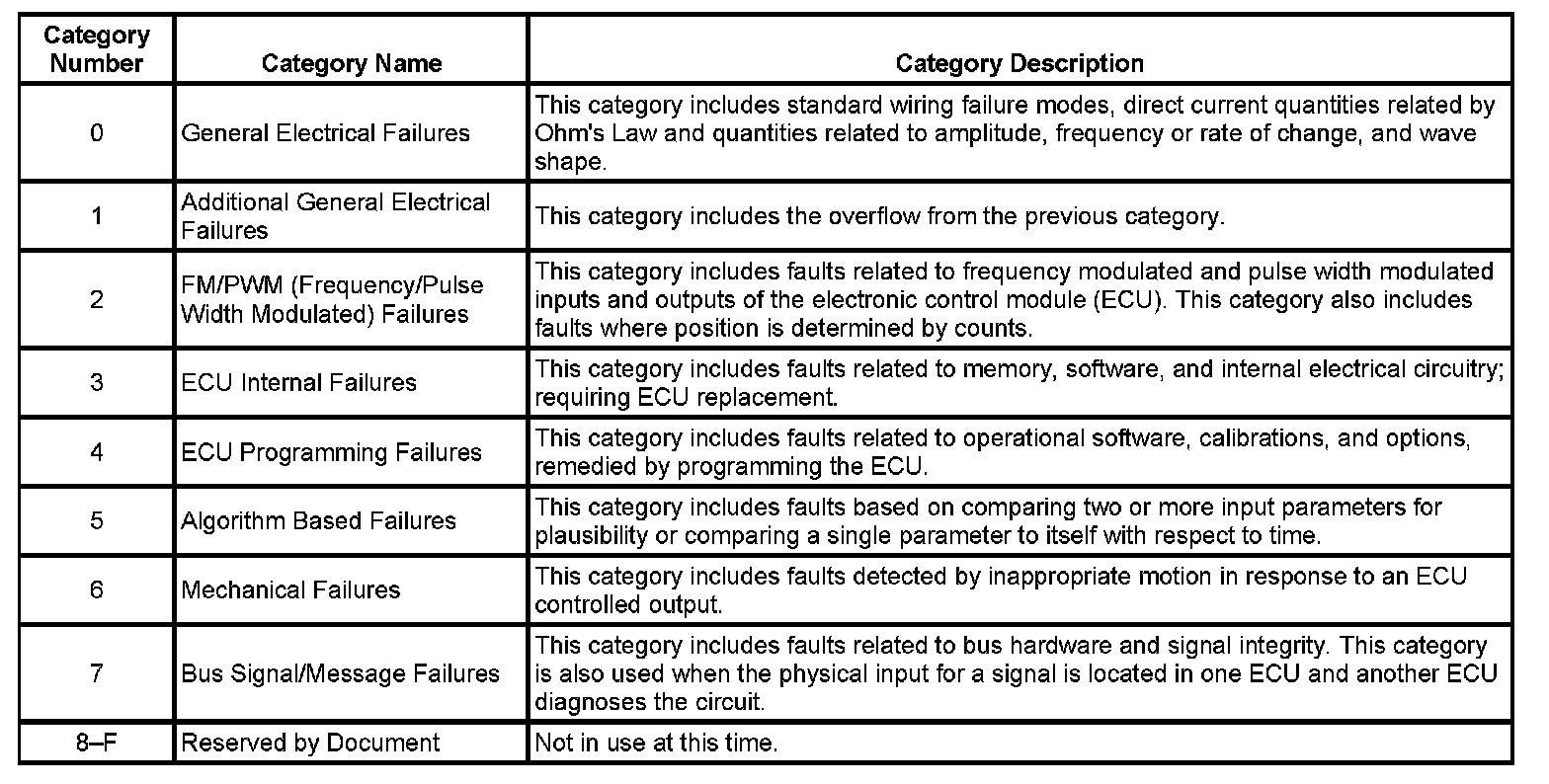 The DTC symptom is made up of 2 alphanumeric digits. The first digit following the DTC indicates the DTC symptom category. There are 16 possible categories available in the range of 0 through the letter F. Currently there are 8 categories in use, 0 through 7. These 8 categories together with their definitions are given.